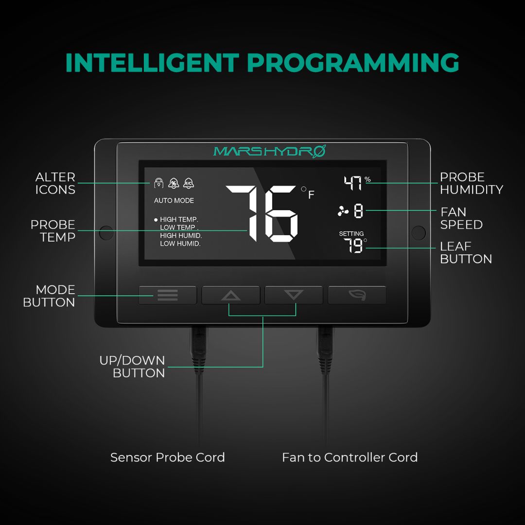 Kit de exaustor e filtro Mars Hydro 6″ (150mm). O sistema de ventilação completo para estufas, com termostato digital para controle de clima.
